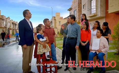 Todo acompañado de imágenes de desarrollos inmobiliarios. Enseguida se ve a Peña Nieto en una calle rodeado por vecinos diciendo: “en cinco años 4 millones de familias se han beneficiado para adquirir una nueva vivienda o mejorar su casa, porque lo bueno cuenta y queremos que siga contando”.