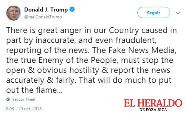 El presidente Donald Trump acusó a la prensa el lunes de ser “el verdadero Enemigo del Pueblo” tras la masacre en una sinagoga y una conspiración con artefactos explosivos.