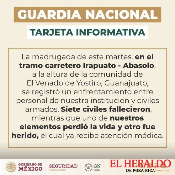 Un enfrentamiento, esta madrugada, entre personal de la Guardia Nacional (GN) y un grupo de hombres armados dejó un saldo de ocho muertos, entre ellos un elemento federal y otro herido, en la comunidad de Venado de Yóstiro, del municipio de Irapuato, informaron fuentes policíacas.