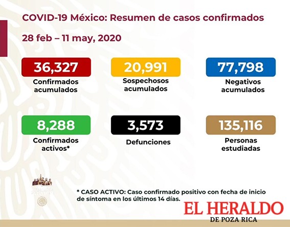 Con corte a las 19:00 horas de este lunes 11 de mayo, en México hay 36 mil 327 casos confirmados de coronavirus Covid-19, informó la Secretaría de Salud (SSa).