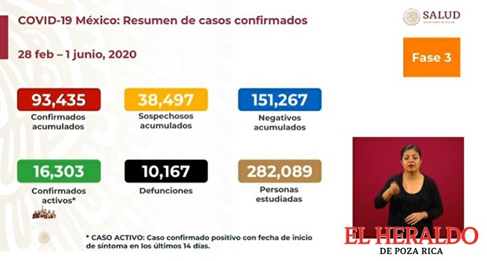 La pandemia de Covid-19 registró un nuevo incremento con 2 mil 771 casos confirmados entre domingo y lunes, para un acumulado de 93 mil 435 hasta el día 1 de junio. En el mismo lapso se agregaron 237 decesos al registro, con lo que se llegó a 10 mil 167 fallecimientos.