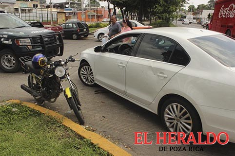 Tremendo susto se llevó un motociclista al impactarse contra el costado de un automóvil en el retorno ubicado frente a la agencia Nissan del bulevar Adolfo Ruiz Cortines, socorristas de Cruz Roja llegaron al lugar del siniestro para auxiliarlo, pero se negó al traslado al nosocomio.