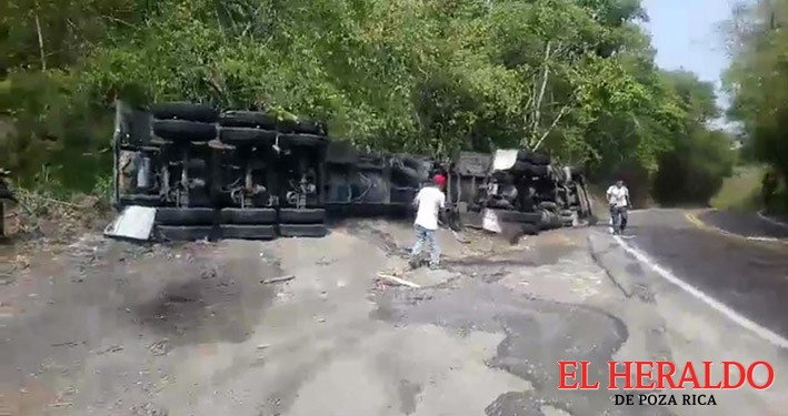 Una pipa de doble remolque que transportaba ácido fosfórico, volcó sobre un costado de la carretera federal 180, en el tramo Gutiérrez Zamora-Papantla, a la altura de la curva conocida como "La Camelia", confirmó el director de Protección Civil Municipal, Jacinto Pérez, quien se trasladó al lugar para atender la contingencia.