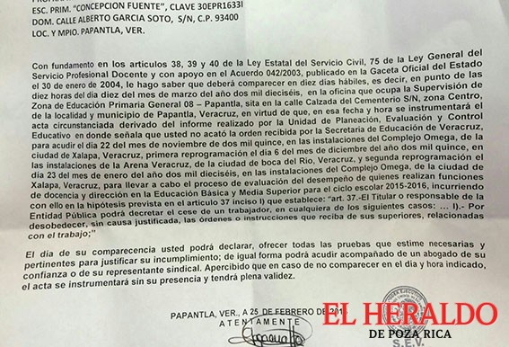 A través de las redes sociales, se difundió el caso de un docente de Papantla que ya fue notificado. En el documento se citan los artículos 38, 39 y 40 de la Ley Estatal del Servicio civil y 75 de la Ley General del Servicio Profesional Docente, así como el acuerdo 042/2003, publicado en la Gaceta Oficial del Estado con fecha de 30 de enero de 2004.