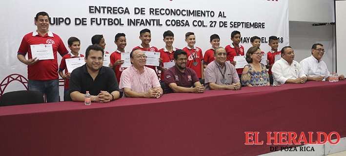 Los integrantes del equipo de futbol soccer infantil COBSA Colonia 27 de Septiembre de Poza Rica fueron objeto de reconocimientos de parte de las autoridades municipales, tras haber alcanzado por segunda ocasión las Semifinales de la Copa Querétaro, celebrada en aquella entidad, durante el pasado mes de marzo.