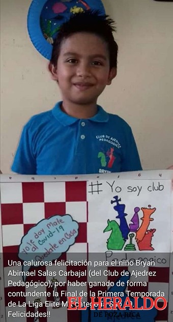 Bryan Abimael Salas Carbajal del Club de ajedrez pedagógico, gracias a sus buenas actuaciones en los torneos de ajedrez en línea, fue seleccionado para reforzar a un club del sur del Estado, específicamente al Club de Ajedrez Minatitlán, que jugaría el torneo Campeón de Campeones, en la liga élite MX en la categoría Sub10.